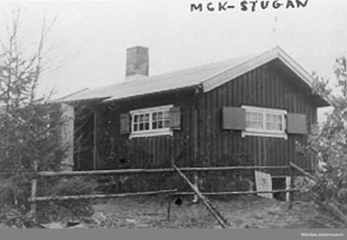 Fotografens namn står som regel inte utsatt, men fotograf är oftast Kalle själv, ibland någon tidningsfotograf och ibland någon klubbkamrat. Under bilden står: STUGAN. På albumets fotografi står: MCK-STUGAN. Den blev klar 1935 och står mitt inne iskogen, mot Ubbhult till. Allt material måste bäras dit, även järnspisen. Den bars dit av en klubbmedlem, som bar den på ryggen. Stugan finns också på MMF 1997:3510.