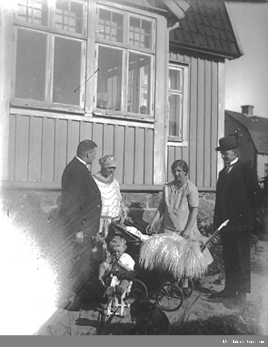 Fässbergsgatan 31 i Toltorpsdalen, Mölndal, på 1920-talet. Fam. Hansson. Holger i barnvagnen och brodern Tore på hästen. Morbror och moster.