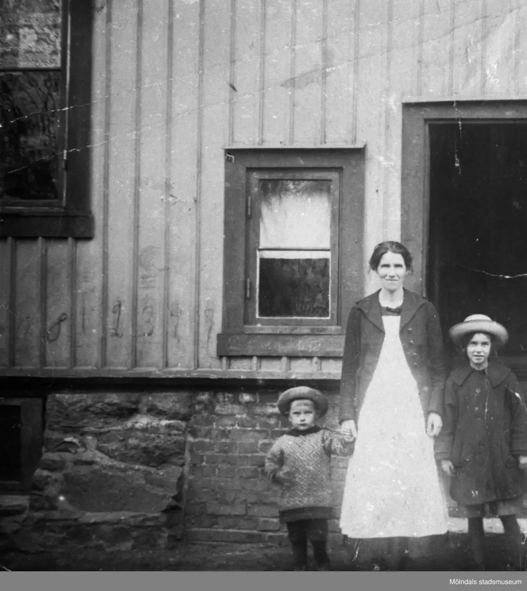 Givaren Knut Anderssons mor Olga samt de äldre syskonen Sara och Evald poserar utanför "Täppan" i Krokslätt. Ca 1921.