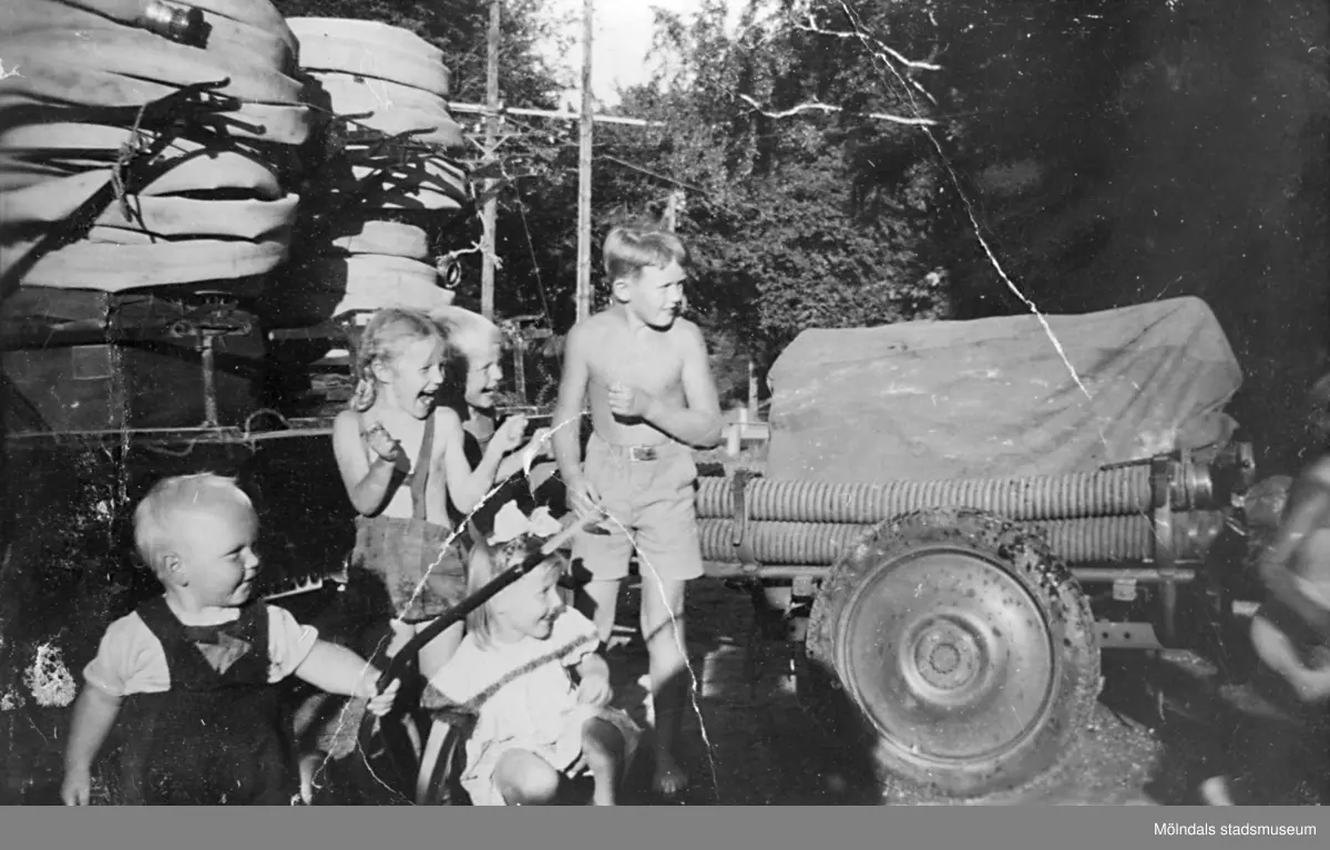 Barnen står vid brandspruta och slangar utanför Lindome brandstation 1950. Den minste är Bengt Karlsson. Vid brandbilen står Monika Ahlgren, Kent Andersson, Yngve Thainsson samt Tiina Mahlakaaska.