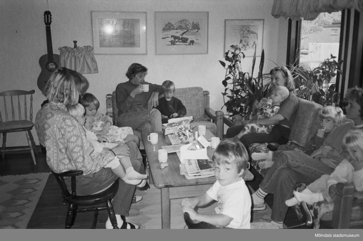Katrinebergs daghem kl 6.30. Fikarast i personalrummet med bl.a. Ann-Britt Thörnblad med barnen Christoffer samt Anne Blom och Anita Nylén med barn. 1992-93.