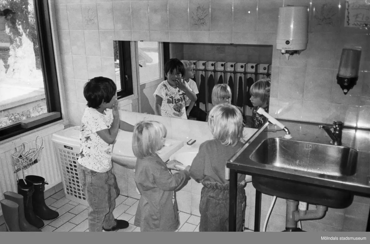 Tre dagisbarn som tvättar sig i tvättrummet på Hoppetossan, Katrinebergs daghem, 1992-93.