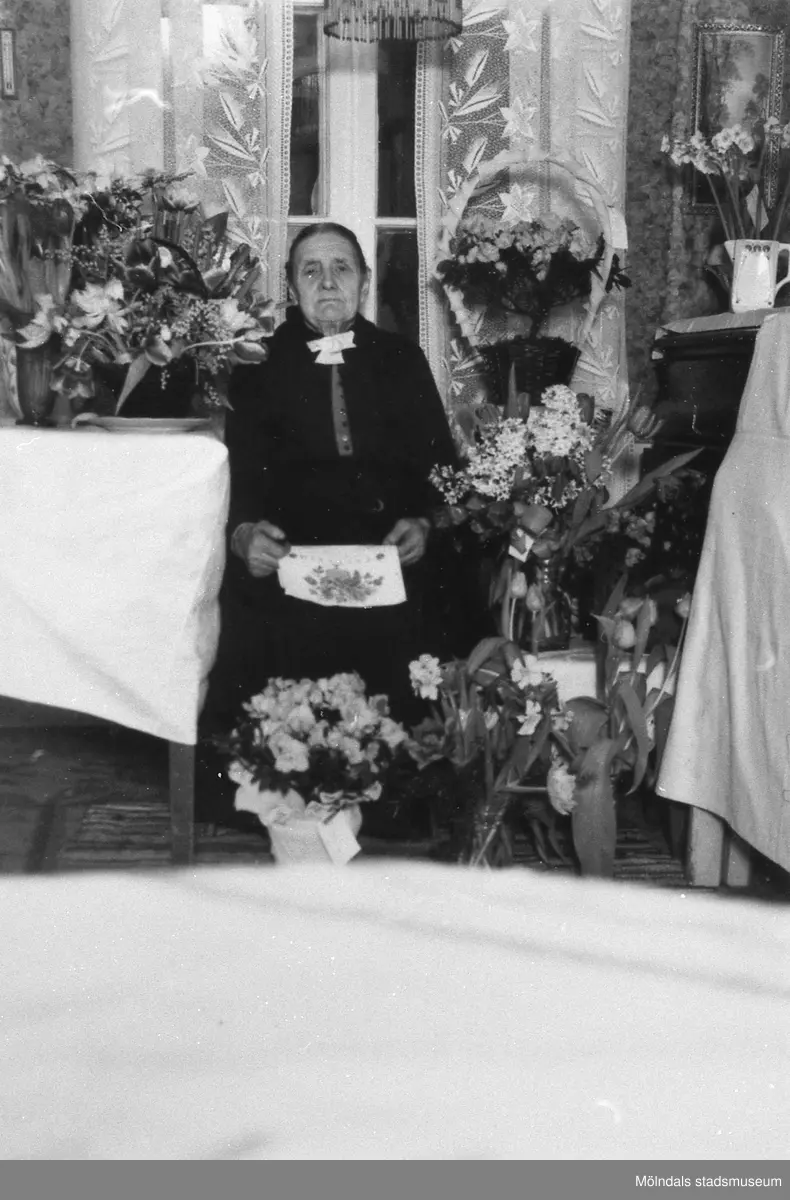 Porträtt på en kvinna sittande vid ett blomsterfyllt bord. En högtidsdag av något slag, 1920-tal. Bilden kommer från ett av Gunnebo slotts fotoalbum.