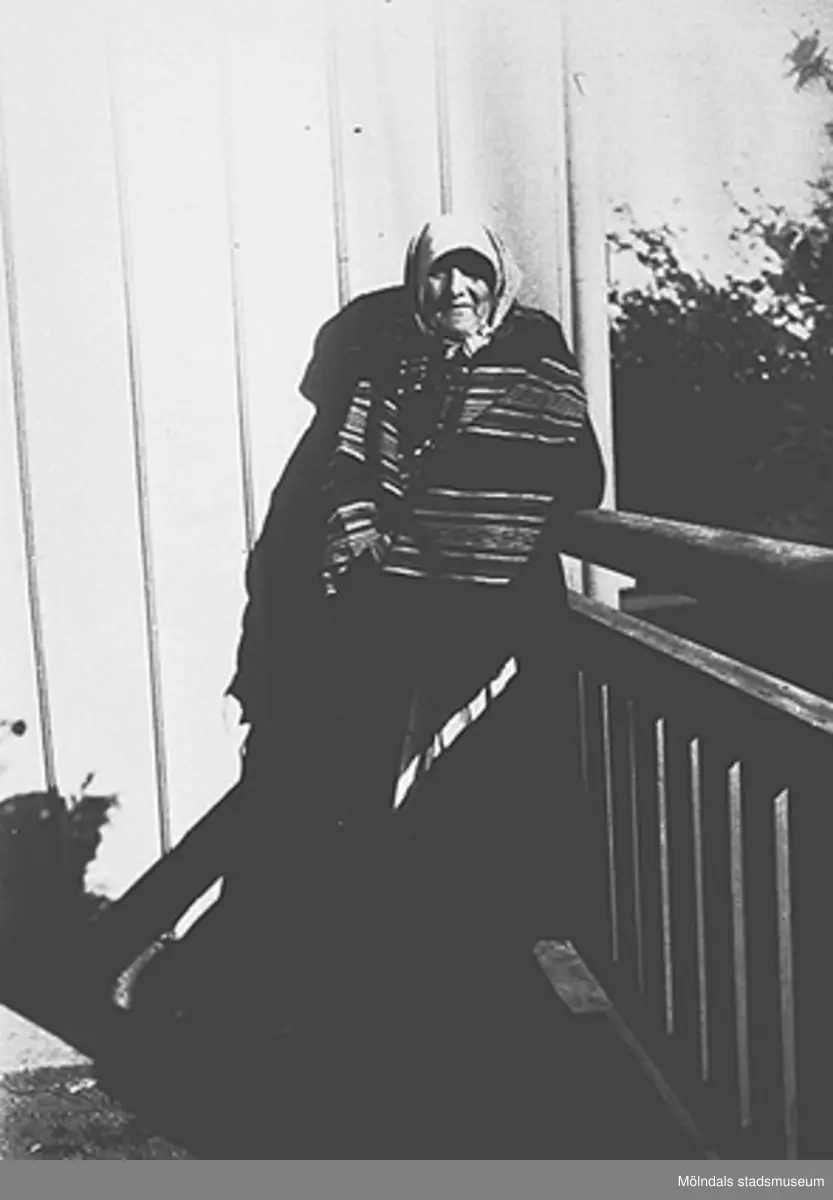 Johanna Mathilda Niklasson (f. Börjesdotter, 1842-1933 från Apelgården) står utanför "Viktors" i Bölet. Hon var gift med August Ludvig Niklasson, Bölet.