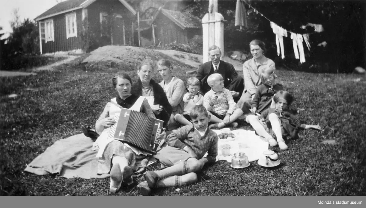 Kaffestund på gräsmattan i Kållered, 1929-1950-tal. Överst; Frans och Vega, under dem barnen Carl-Uno, Lennart, Sonja och Sture. Helga med dragspelet. Bakom henne sitter Maria och Valborg Magnusson.