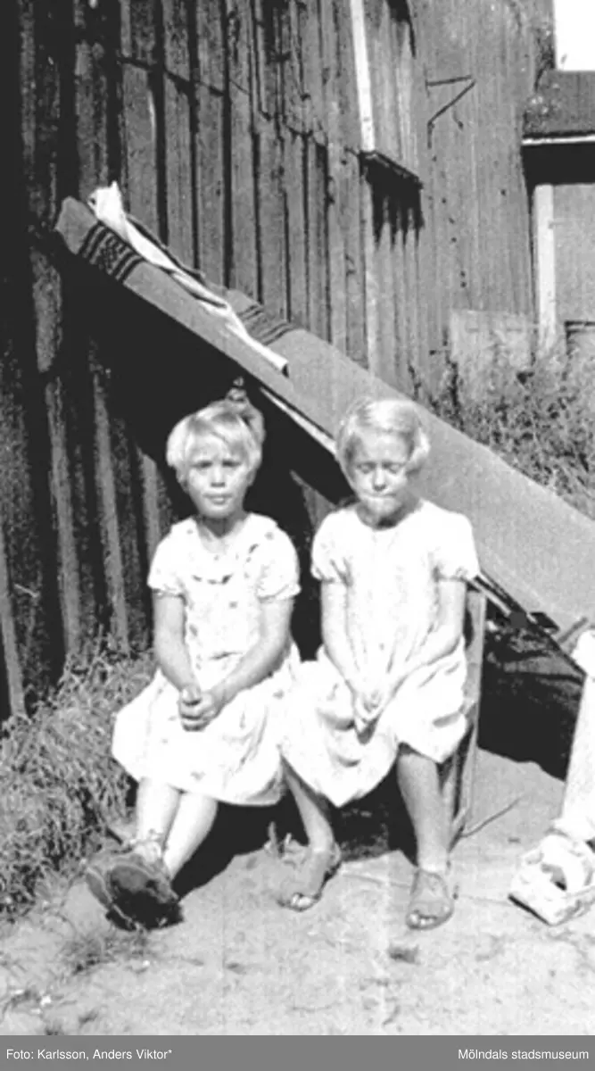 Två flickor (Ulla Vesterberg och Birgit Karlsson) tältar med en filt som är fastspikad i väggen. De sitter på bakgården till Kvarnfallet 31, 1930-tal. Bostadshuset tillhörde Carlsfors fabriker.