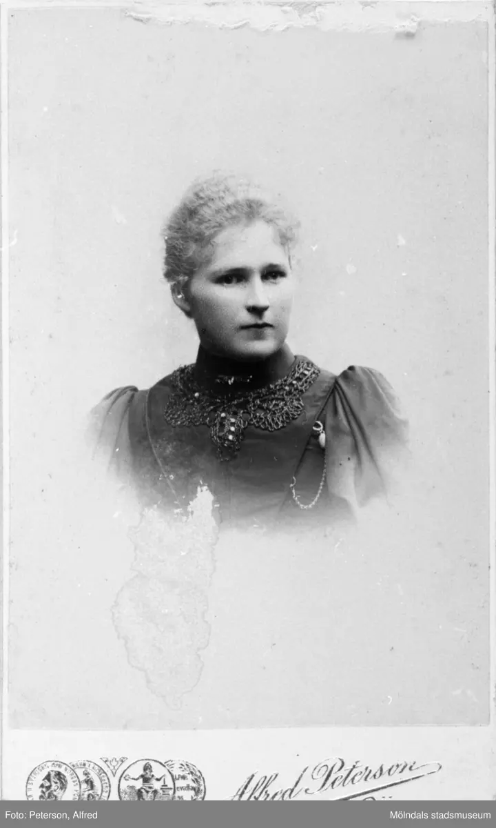 Porträttfotografi av Amalia Precht-Reuter (1871-1956), som vid tillfället i fråga var 18 år. Hon var dotter till mäster Precht-Reuter, sockerbruksmästare vid Korndals bruk, senare vid Carnegies bruk.