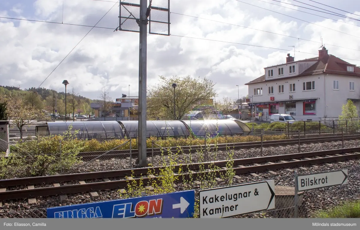 Vy över järnvägsspår och servicebutik (vit byggnad) från Bangårdsvägen i Kållereds centrum. I bakgrunden syns Vommedalsområdet, gul byggnad med Nisses pizza samt restaurang och parkering.