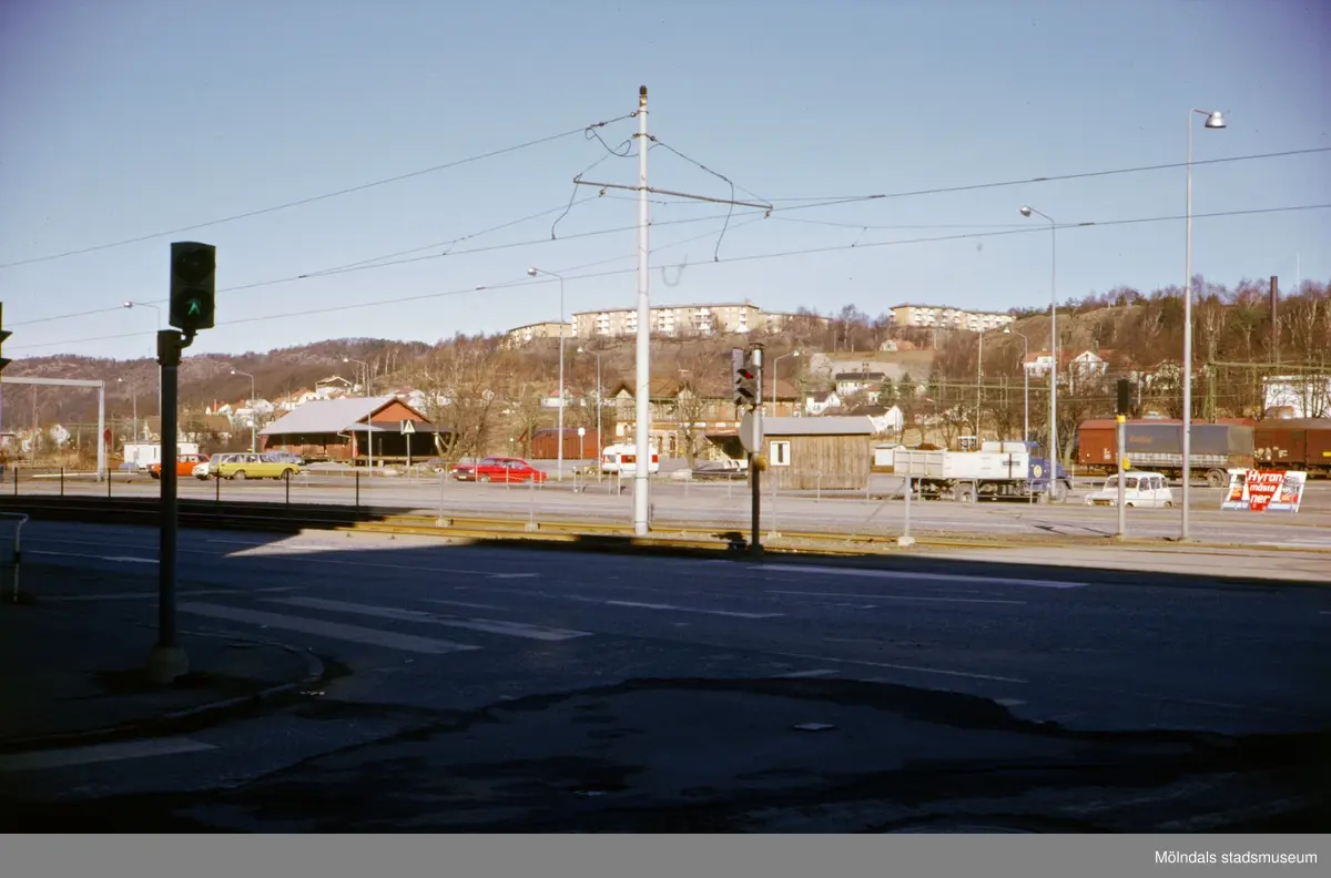 Vy från Frölundagatan i Mölndal över Göteborgsvägen mot järnvägsstationen Mölndals Nedre, troligen på 1970-talet. I fonden, på höjden, ses även bostadsbebyggelse i stadsdelen Enerbacken.