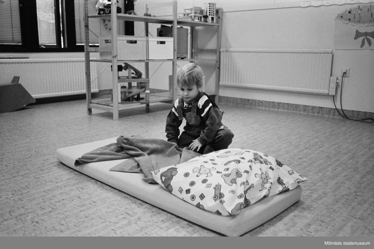 Henrik rättar till filten efter att ha bäddat klart den mjuka madrassen med kudde. Madrassen ligger på golvet i ett lekrum. Lunkentussen, Katrinebergs daghem 1992.