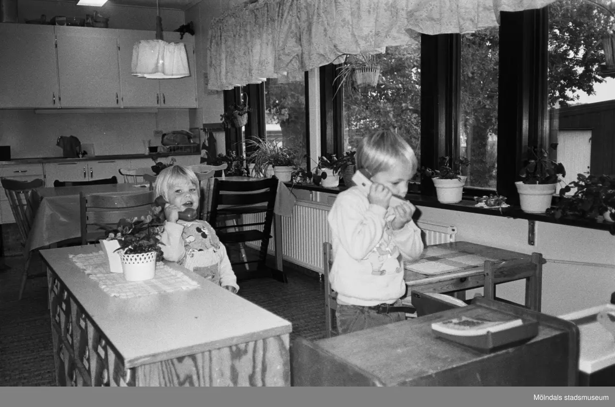 Två barn sitter i köket och låtsaspratar med varandra i var sin telefon. Det ena barnet tittar mot fotografen. Katrinebergs daghem, 1992.