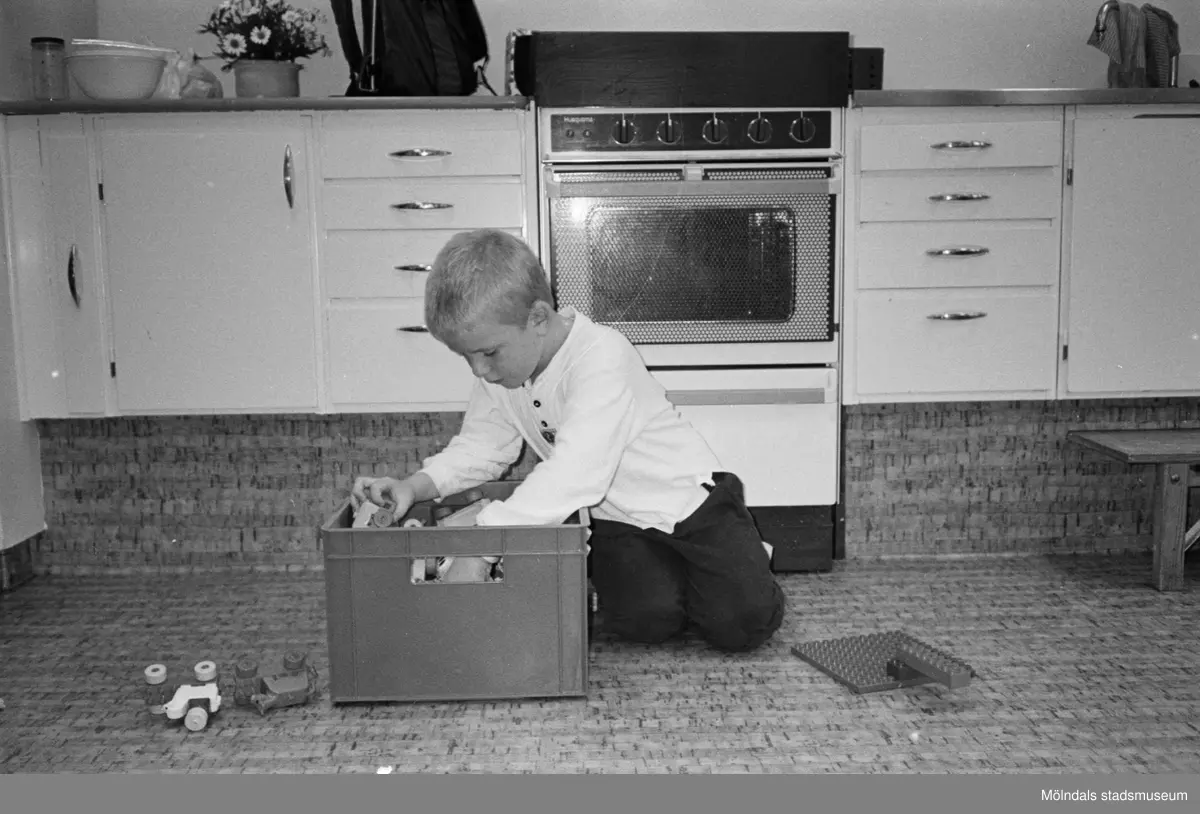 Pontus sitter på köksgolvet och letar runt i en plastback som är fylld med duplo-lego. En byggplatta och ett par duplo-bilar ligger på golvet. Hoppetossan, Katrinebergs daghem, 1992.