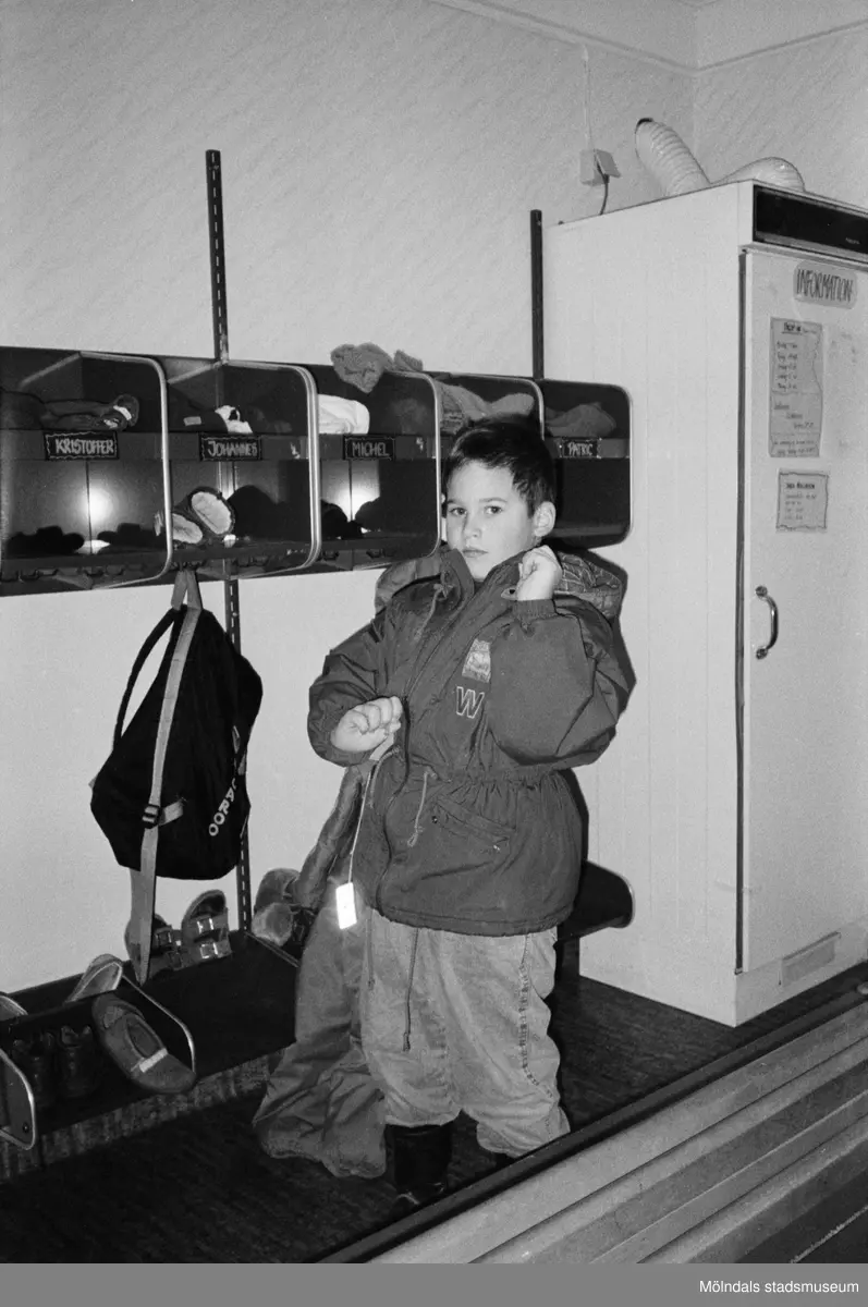 Johannes drar ner dragkedjan på sin jacka. På väggen brevid finns fack där barnen har lagt sina ombyteskläder. Entrén på Trudelutten, Katrinebergs daghem, 1992.