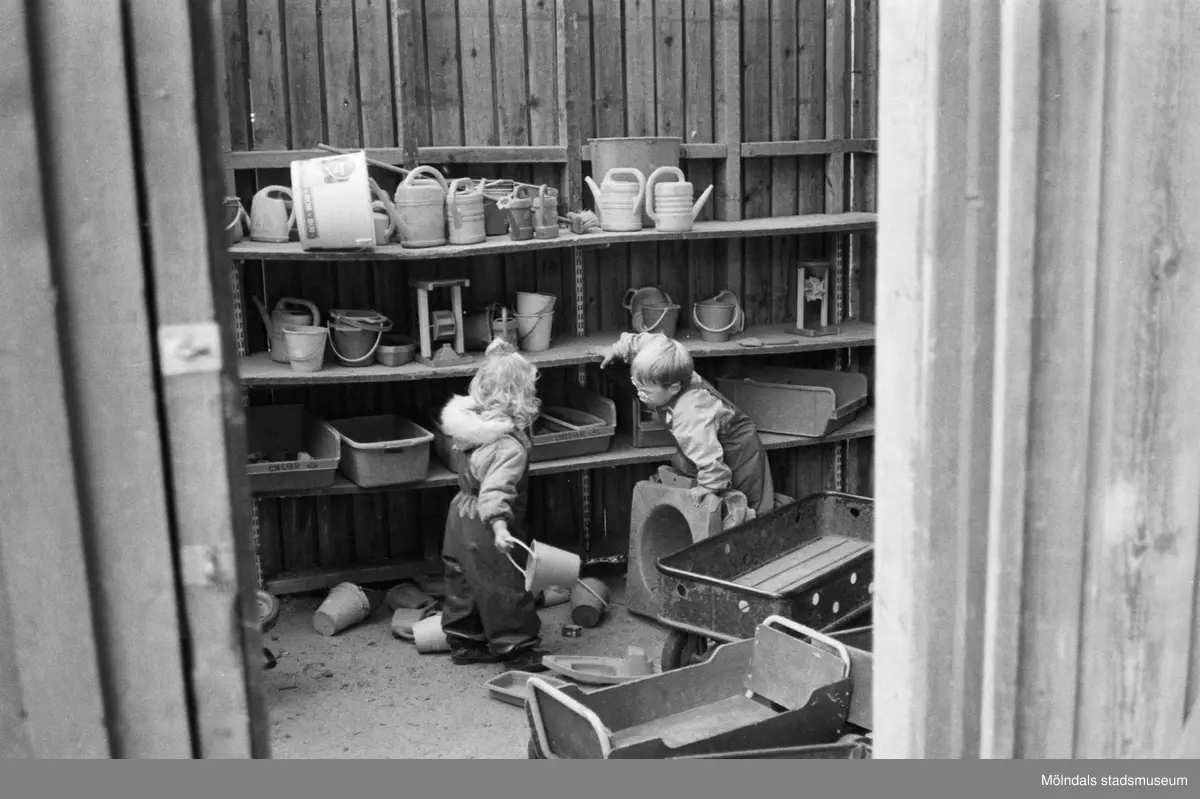 Två barn står inne i Katrinebergs daghems uteförråd. Detta är fyllt av allehanda leksaker för utomhusbruk. 1992.