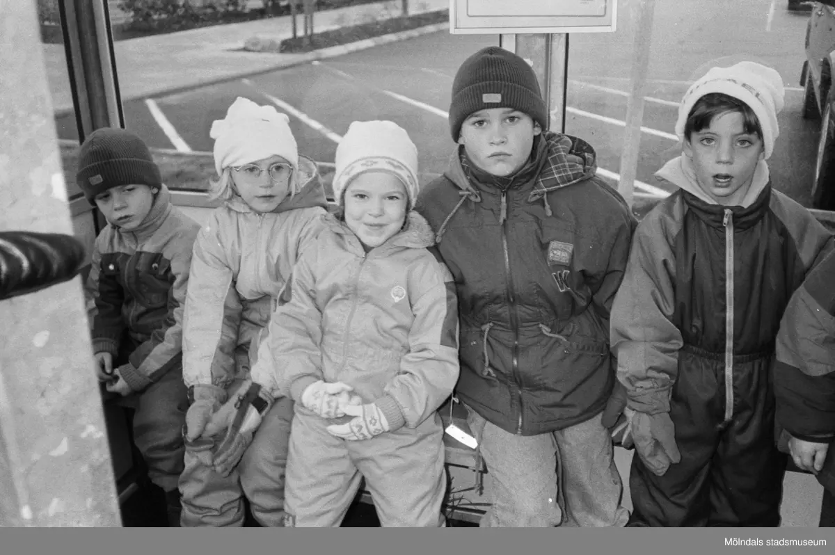 Fem barn, iklädda jackor, mössor och vantar, sitter/står i en busskur. I bakgrunden syns tomma parkeringsplatser. Utflykt med Katrinebergs daghem, 1992.