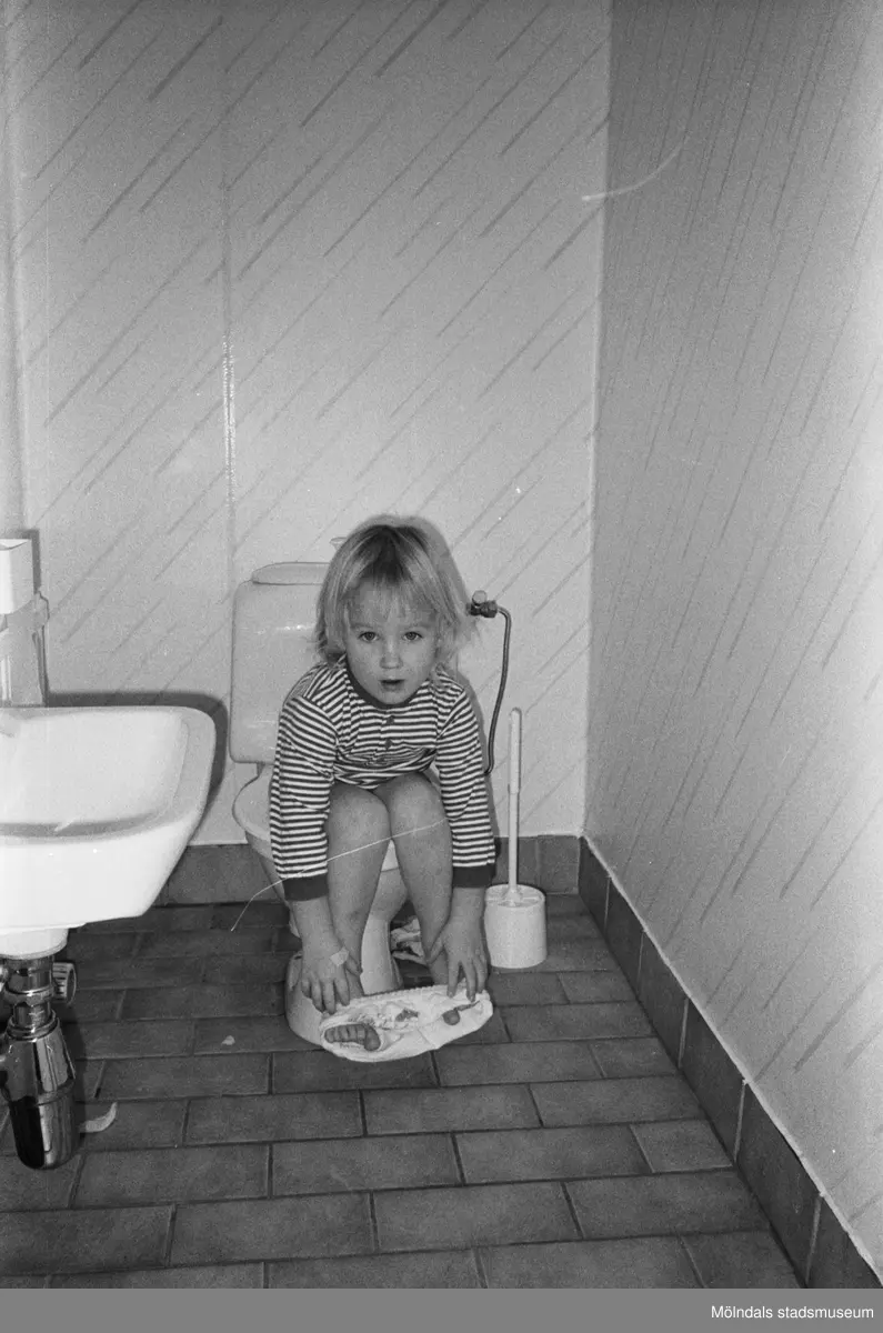 Ett barn som sitter på toaletten. På golvet ligger klinkers och till vänster syns ett handfat. Lille Skutt, Katrinebergs daghem, 1992.