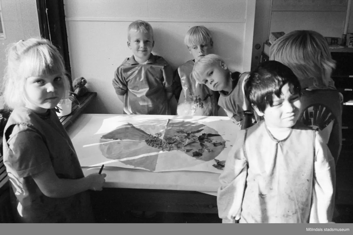 Sex dagisbarn, stående runt ett bord, som gemensamt har målat/ritat en stor teckning. Katrinebergs daghem, 1992-93.