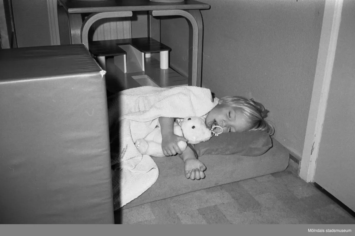 Ett litet barn med napp och nalle, ligger och sover på en kudde och madrass placerad på golvet. Katrinebergs daghem, 1992-93.