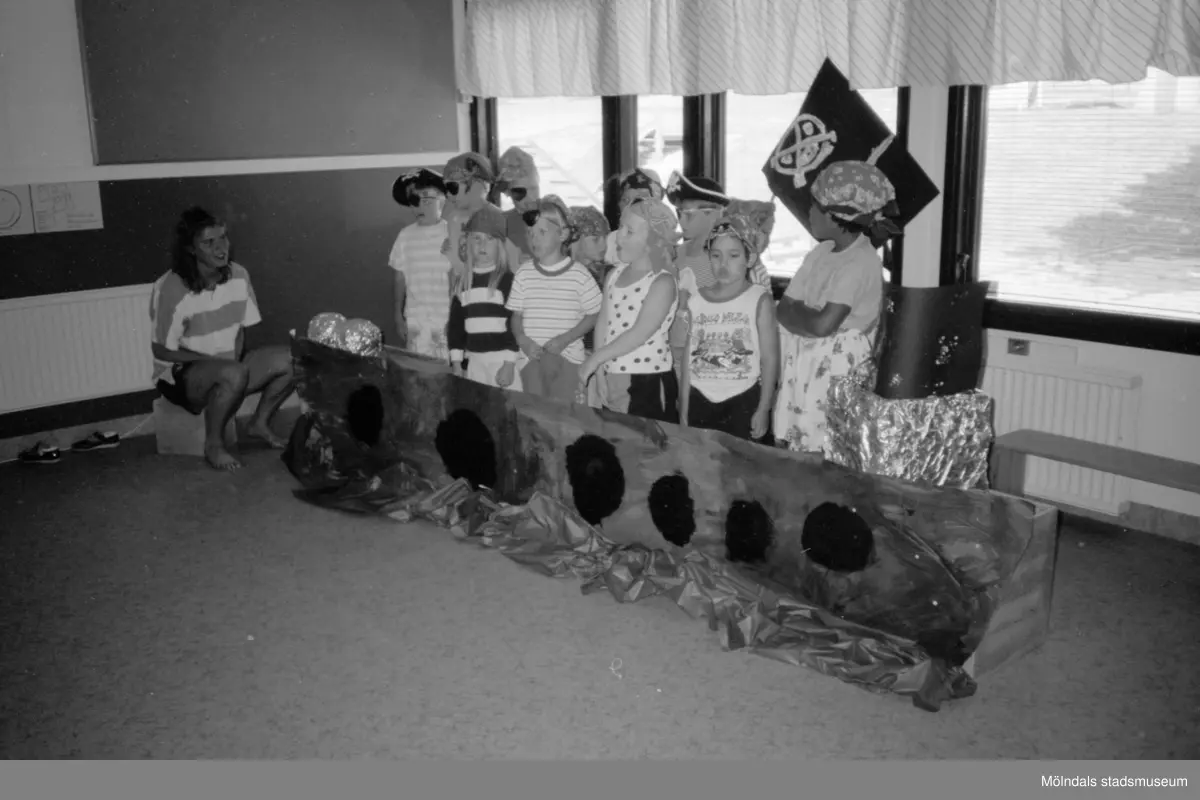 Flera utklädda sjörövarbarn står inomhus och har teaterföreställning bakom en pappersmur. Deras fröken ser på, sittandes på en pall. Katrinebergs daghem, 1992-93.
