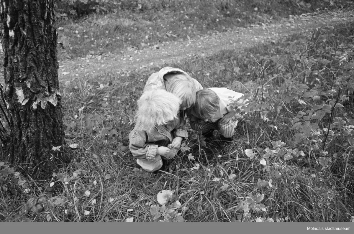 Tre små barn sitter hukade vid en grässlänt. De tittar på något på marken. Till vänster ser man en trädstam.