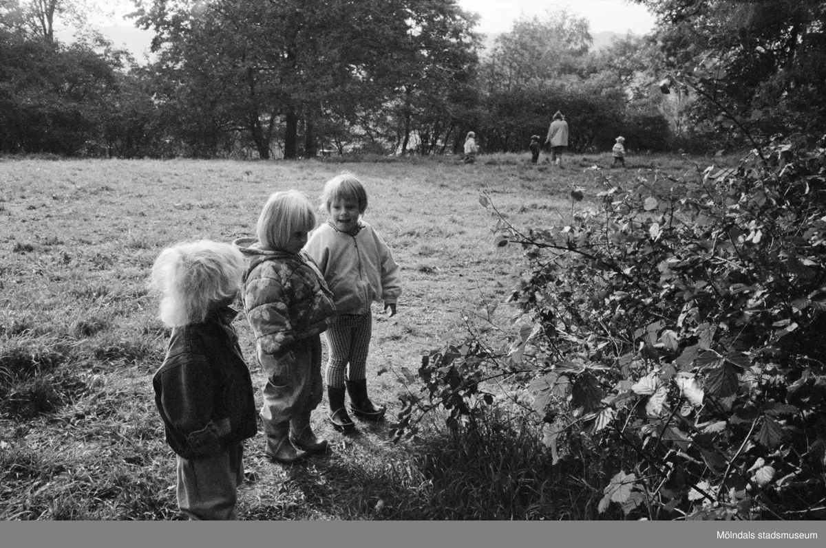 Tre små barn står på en gräsmatta och tittar på växtligheten utanför Katrinebergs daghem. I bakgrunden syns fler barn samt fröknar.