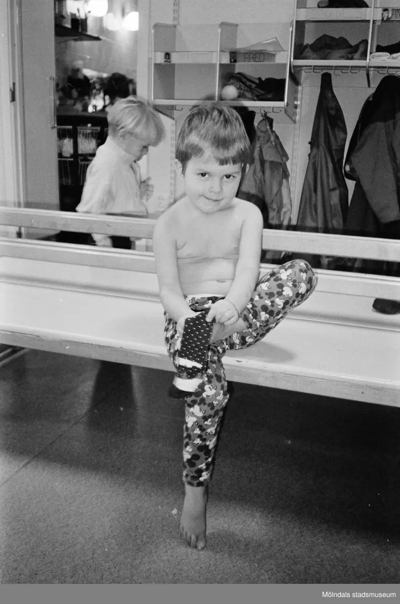 Alexandra sitter på en träbänk inomhus och sätter på sig sockor. Hon har naken överkropp och Musse Pigg-tights. Lunkentussen, Katrinebergs daghem 1992.