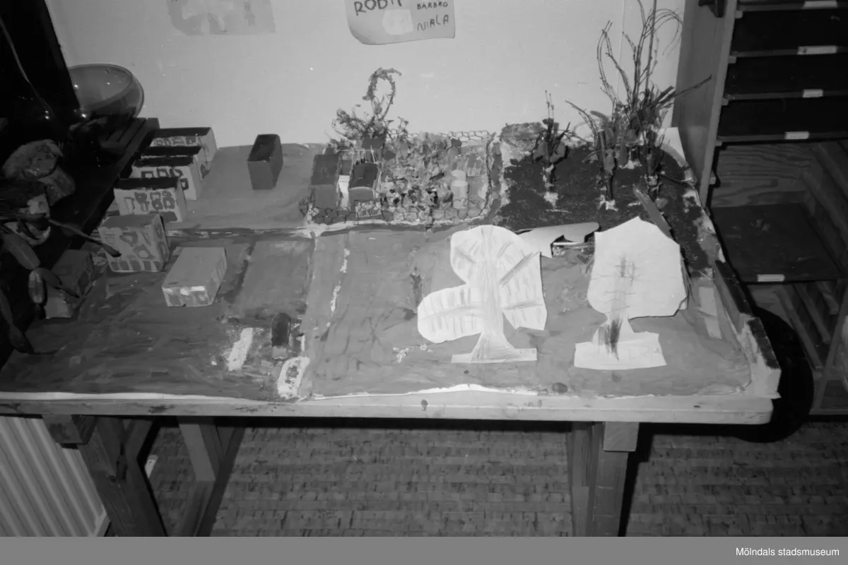 Dagisbarnen vid Katrinebergs daghem har gjort flera utomhusmiljöer i miniformat genom att skapa hus, träd osv. Här ser man fyra varianter ståendes på ett träbord.