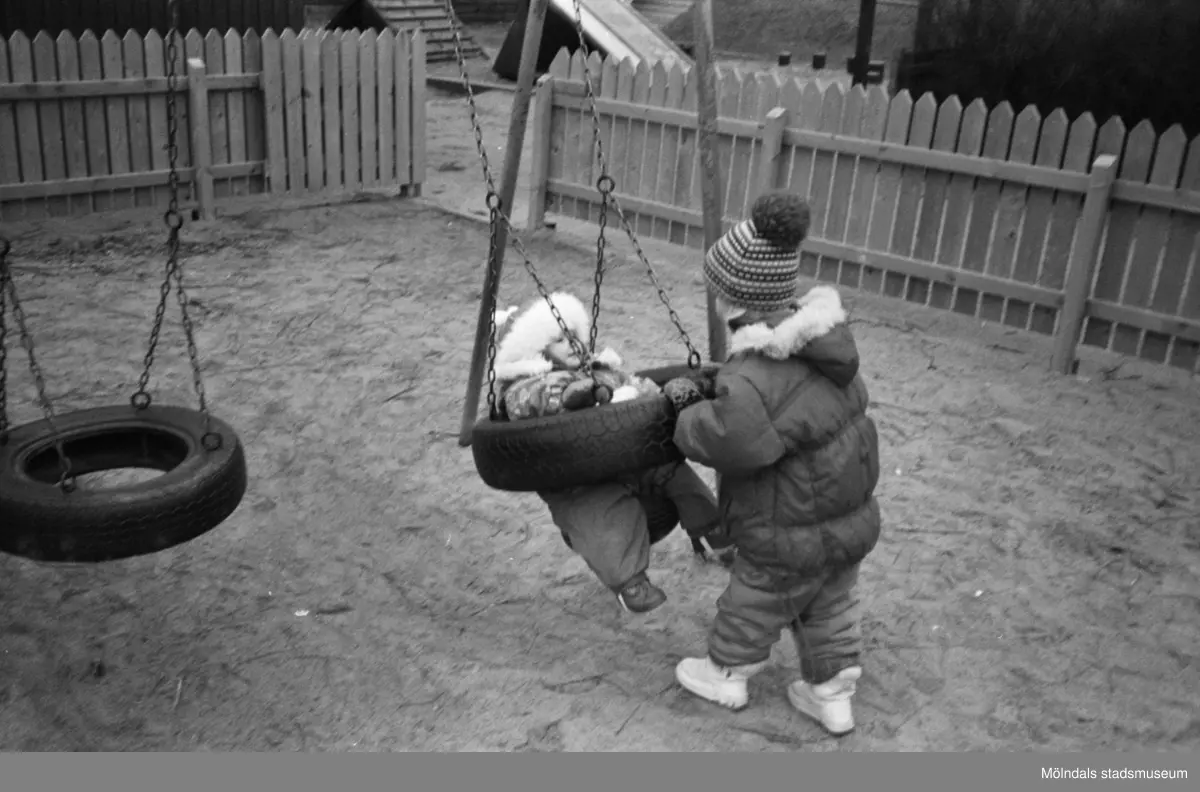 Ett cirka 4-årigt barn gungar ett mindre barn som sitter i en barngunga bestående av däck. De är på lekplatsen med sand utanför Katrinebergs daghem.