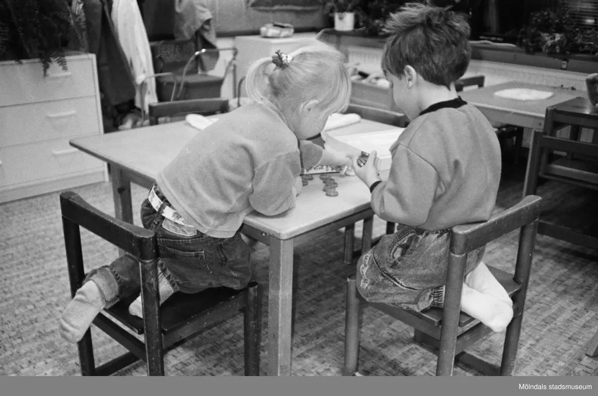 En flicka och en pojke, fotograferade bakifrån, sitter vid ett lågt bord och pysslar. I bakgrunden ser man leksaker och fler bord för barn. Katrinebergs daghem, 1992-93.