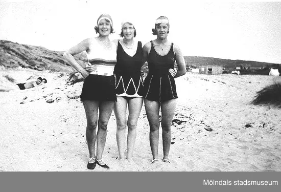 Tre unga kvinnor på en sandstrand, 1920-tal