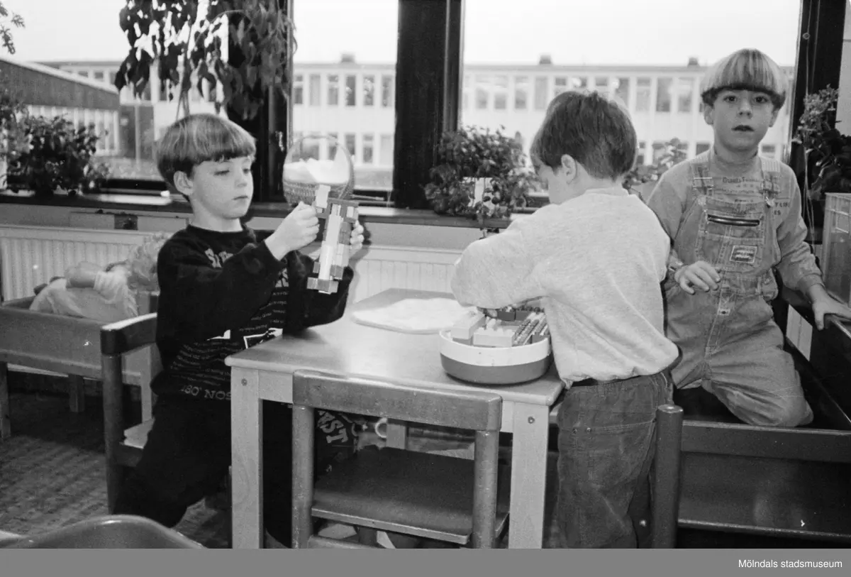 Tre pojkar sitter vid ett barnbord och leker med Duplo-lego. Vid sidan av dem står en docksäng. I bakgrunden syns fönster med Åbyskolans fasad. Katrinebergs daghem, 1992.
