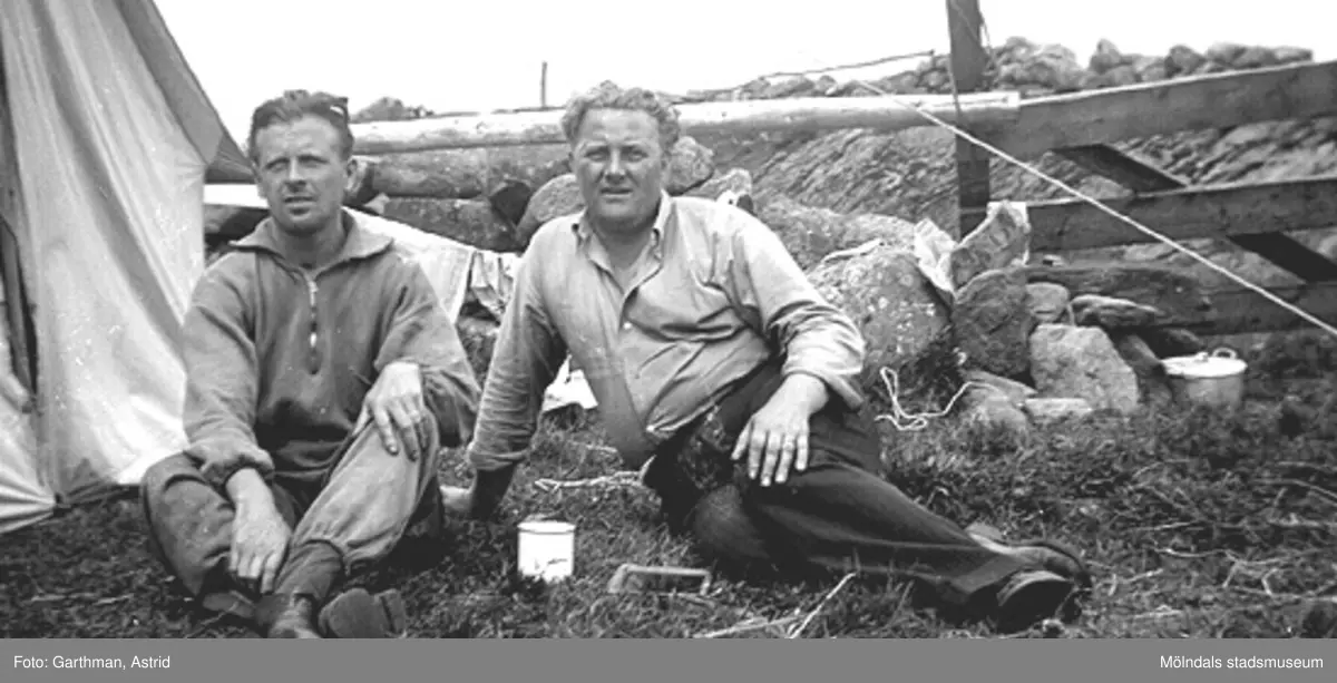 Helmer Garthman och Gustav Andersson tältar i Limmared, Fjärås under 1940-talet. Skänkt av sonen Alf Garthman som arbetade många år på Mölndals stadsmuseum.
