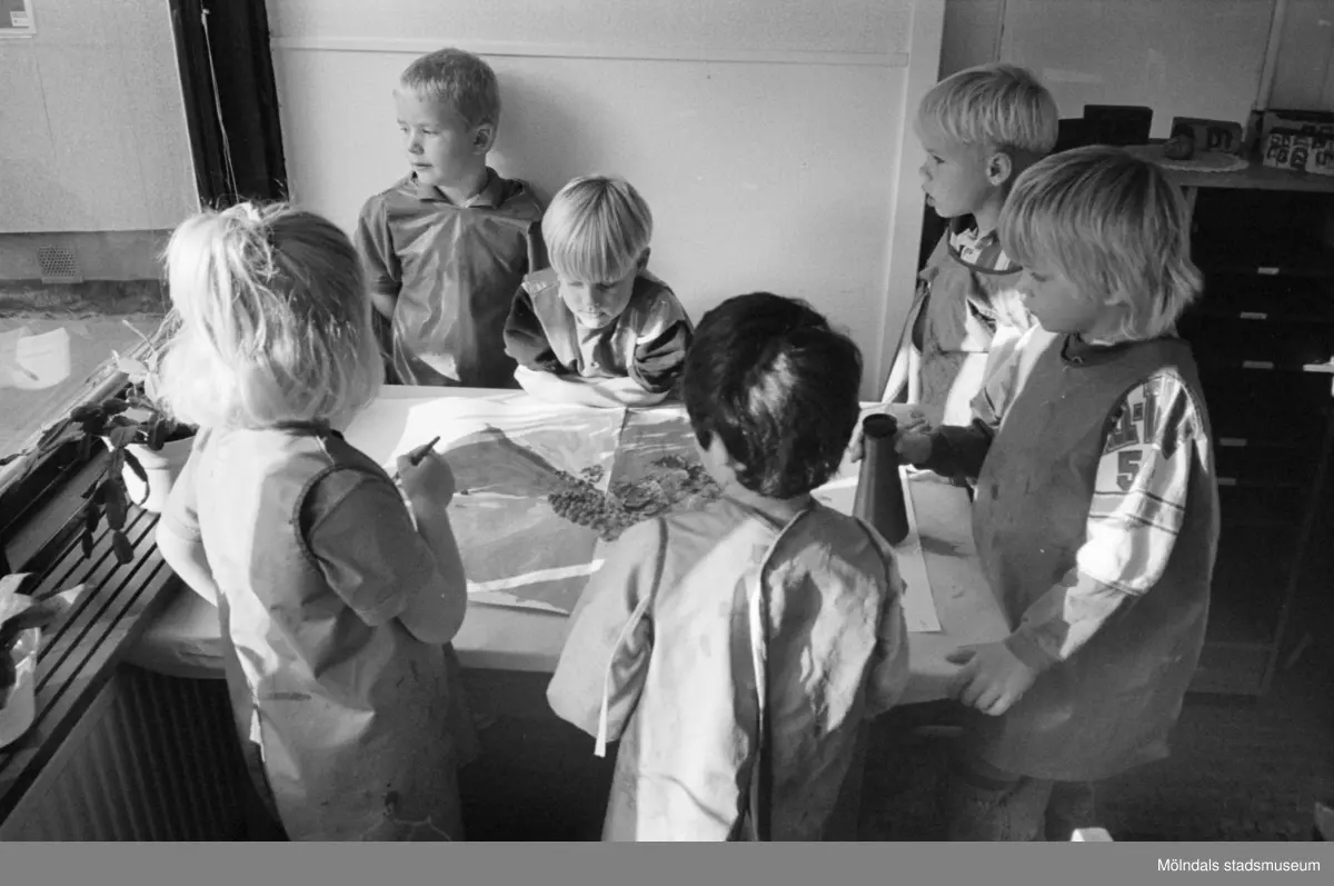 Sex barn står runt ett bord och målar en stor teckning tillsammans. Hoppetossan, Katrinebergs daghem, 1992-93.