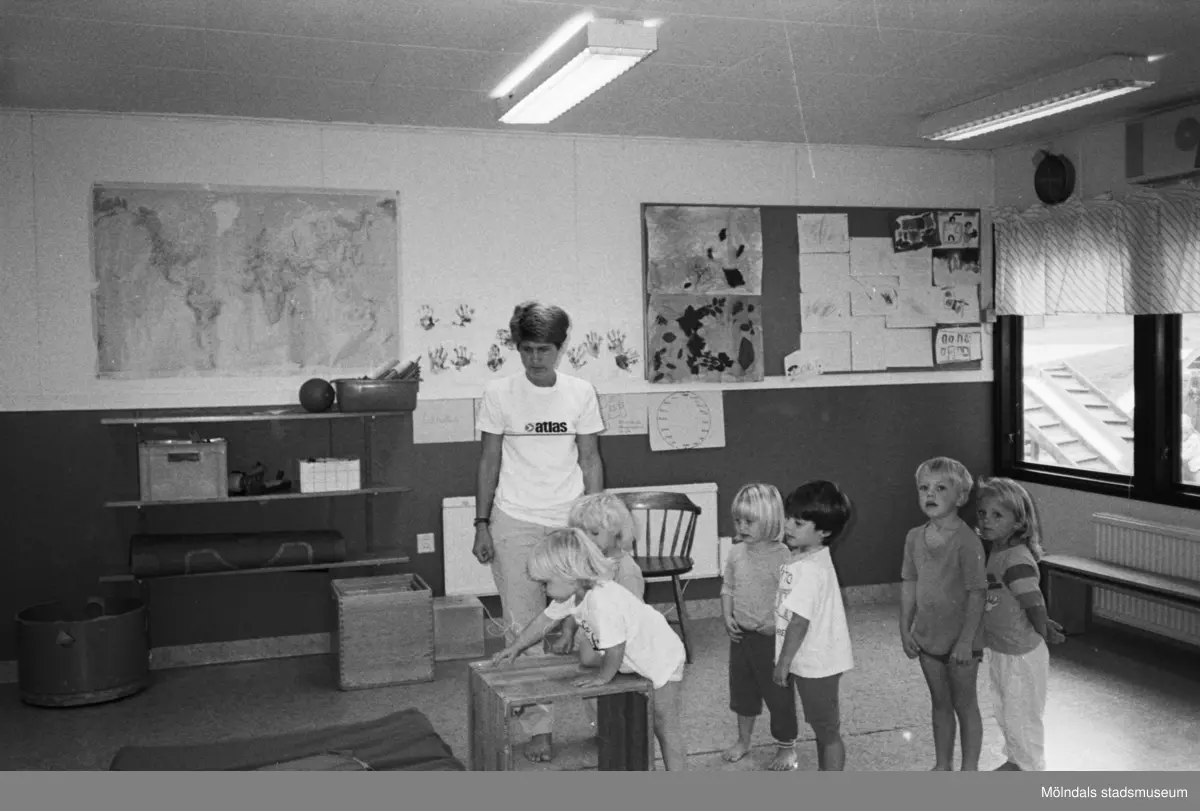 Barbro Hermansson har gymnastik med dagisbarnen på Hoppetossan, Katrinebergs daghem, 1992-93.
