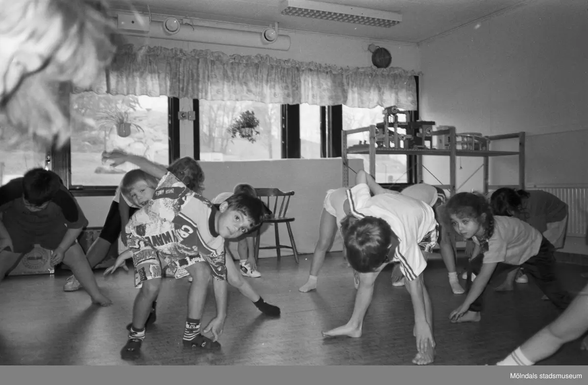 Gymnastik inomhus för Robin, Basoz och fler barn på Lunkentussen, Katrinebergs daghem 1992.