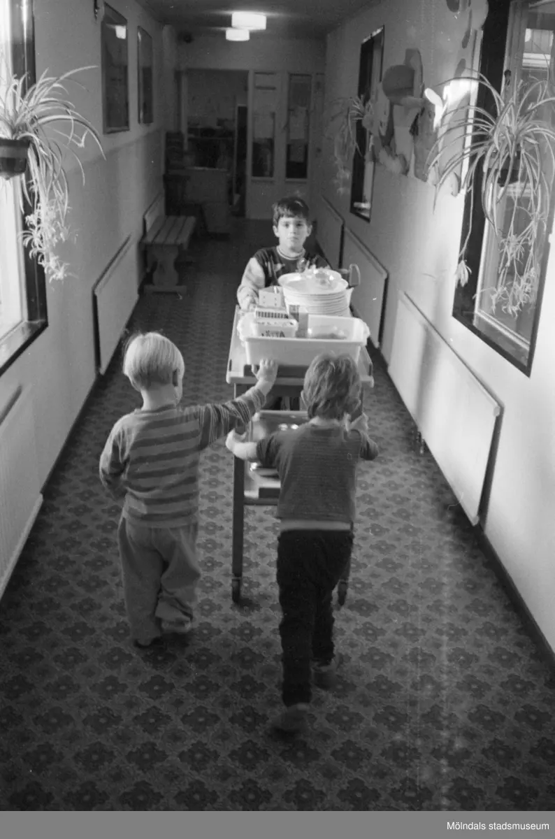 Robin, Fred och Alexandra går med en matvagn i korridoren vid Lunkentussen, Katrinebergs daghem, 1992-93.
