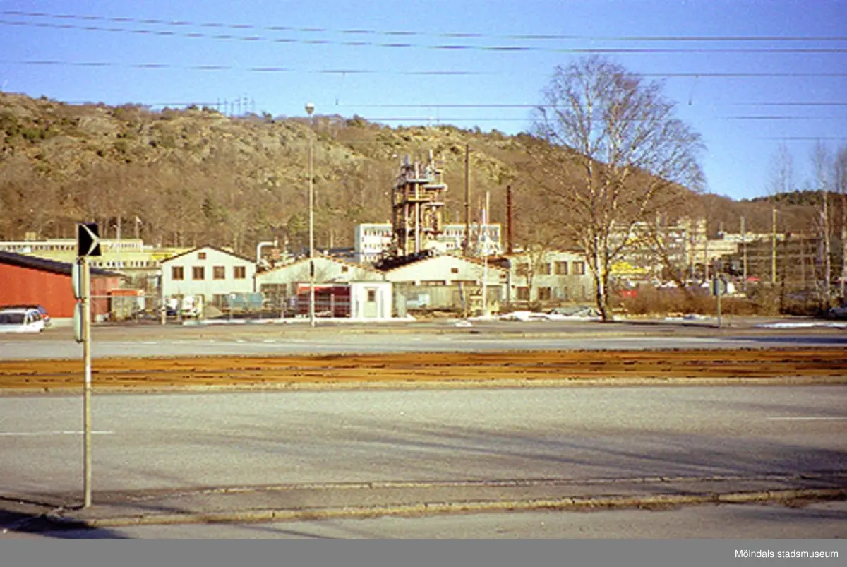 Byggnadsdokumentation av Akzo Nobel på Ågatan 44 i Lackarebäck, 2000-02-15. Rallarberget ses i bakgrunden.