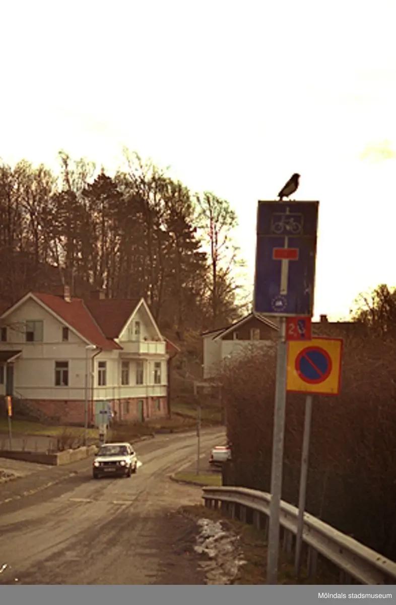 Skyltar mittemot gamla sjukstugan, f.d polishuset och där Mölndals museum tidigare låg (1986-2002), Norra Forsåkersgatan 19 år 2001. På en utav skyltarna sitter en fågel. Den vita byggnaden till vänster ligger på Norra Forsåkersgatan 21.