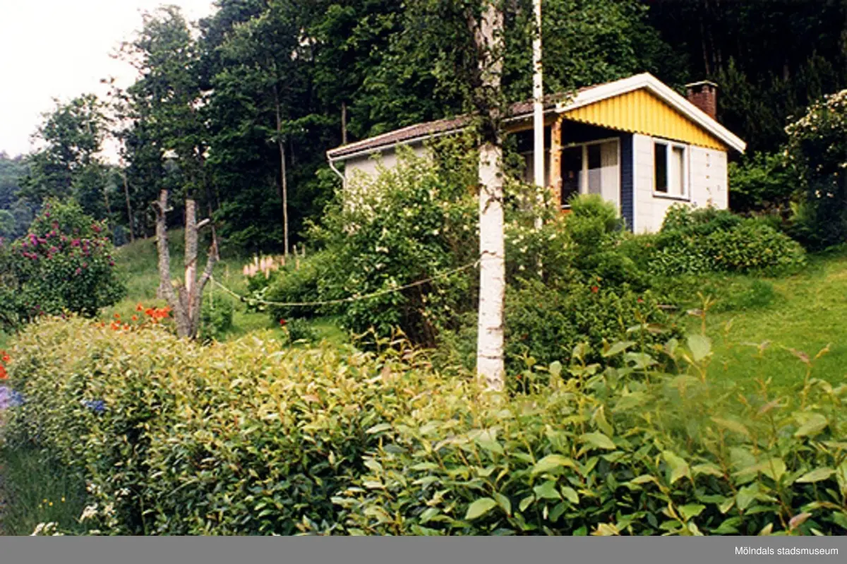 Ett bostadshus på Spårhagavägen (nu: Stamåsvägen 12), Hällesås 1:66, Gastorp i Lindome 1999-06-24. Det hänger en tvättlina mellan träden i trädgården. Relaterat motiv: 2004_1185.