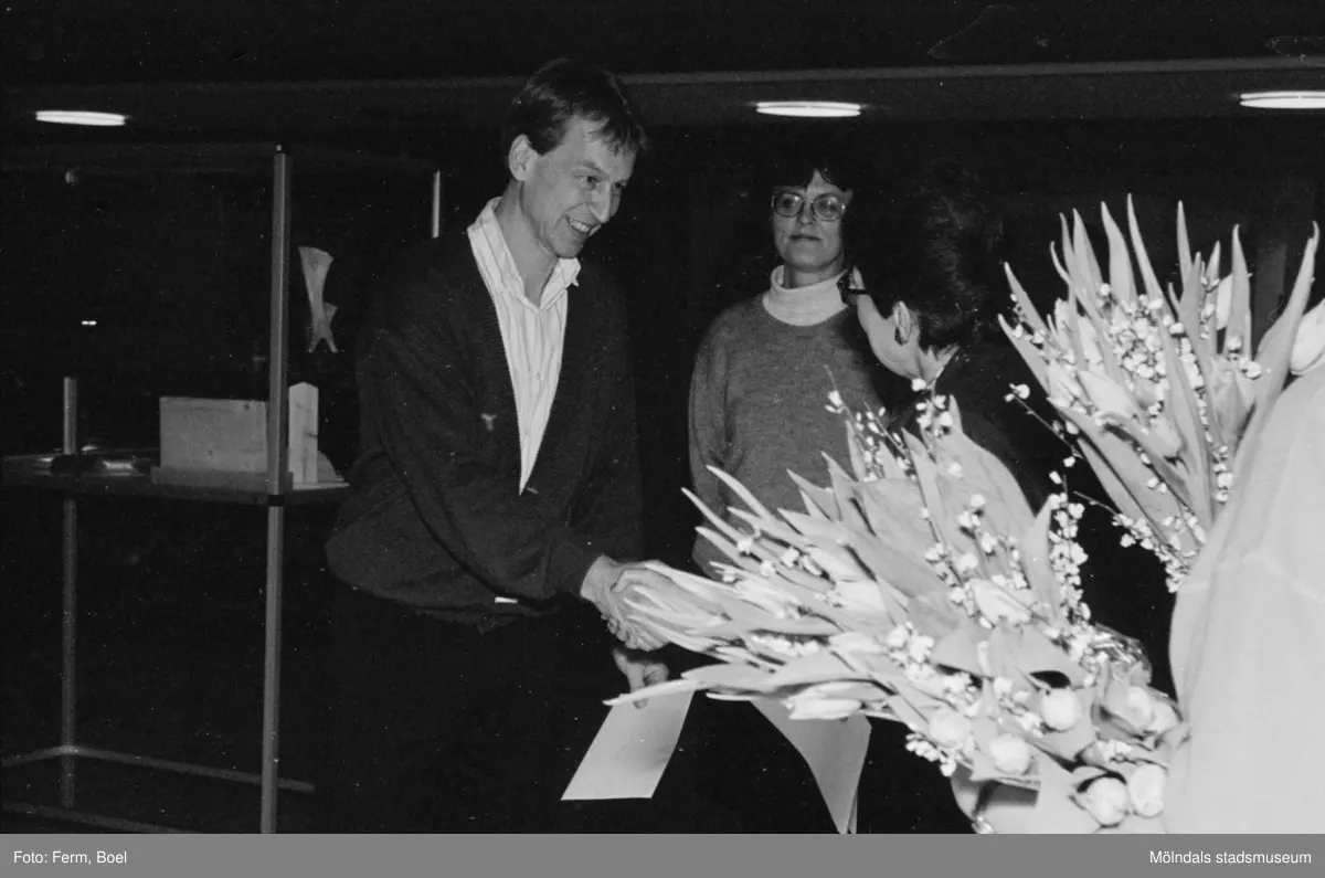 Prisutdelning i Mölndals stadshus vid tävling om Mölndals souvenirer i februari 1992. Konstintendent Bodil Magnusson står som andra person från vänster.