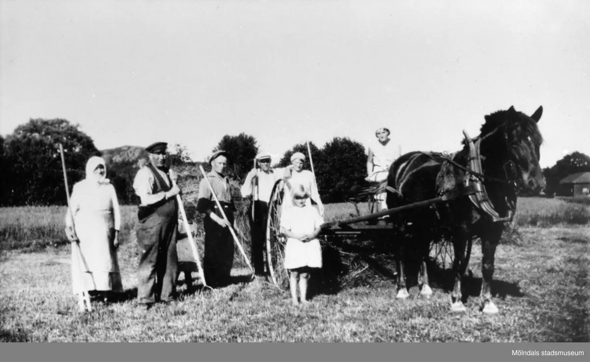 Olle, Anton, Arvid, Gunhild, Ingrid, Elvy och Klara Svensson slår hö vid Nersgården., 1930.