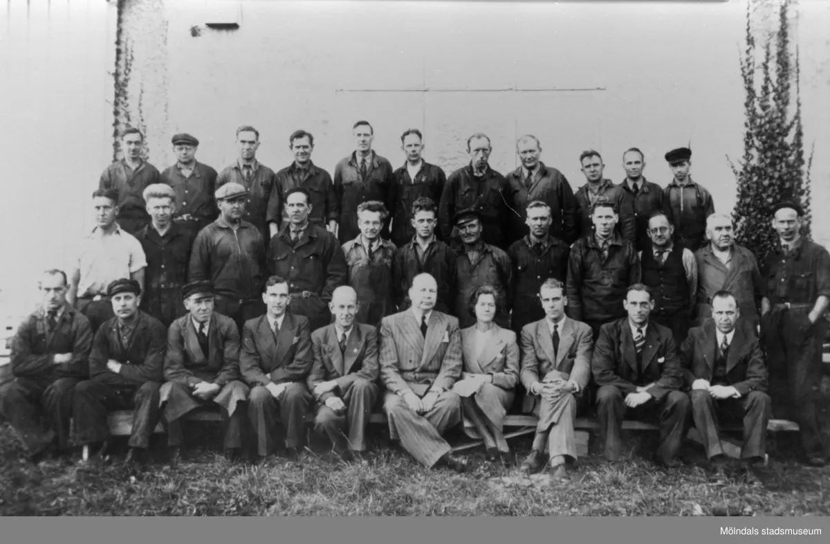 A.B. Pumpindustri arbetare uppställda för foto, 1950-talet. Helmer Garthman står