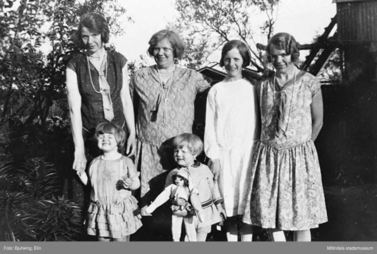 Elin Andersson med syskon och syskonbarn på 29-årskalas. Från vänster: Helga (Andersson) Esbjörnsson med dottern Gun, Gertrud (Andersson) Larsson med sonen Ingemar, Aina Rundberg och Elin Andersson (gift Bjufwing).