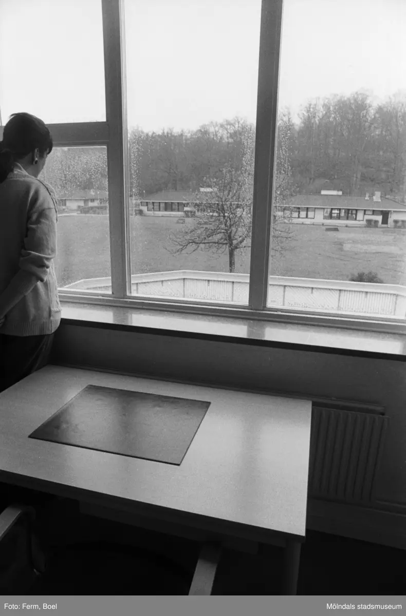 Dokumentation av Sagåsens flyktingförläggning 1992. En kvinna, med håret uppsatt i hästsvans, står och tittar ut genom ett fönster som vätter mot en lekplats samt andra byggnader i bakgrunden.