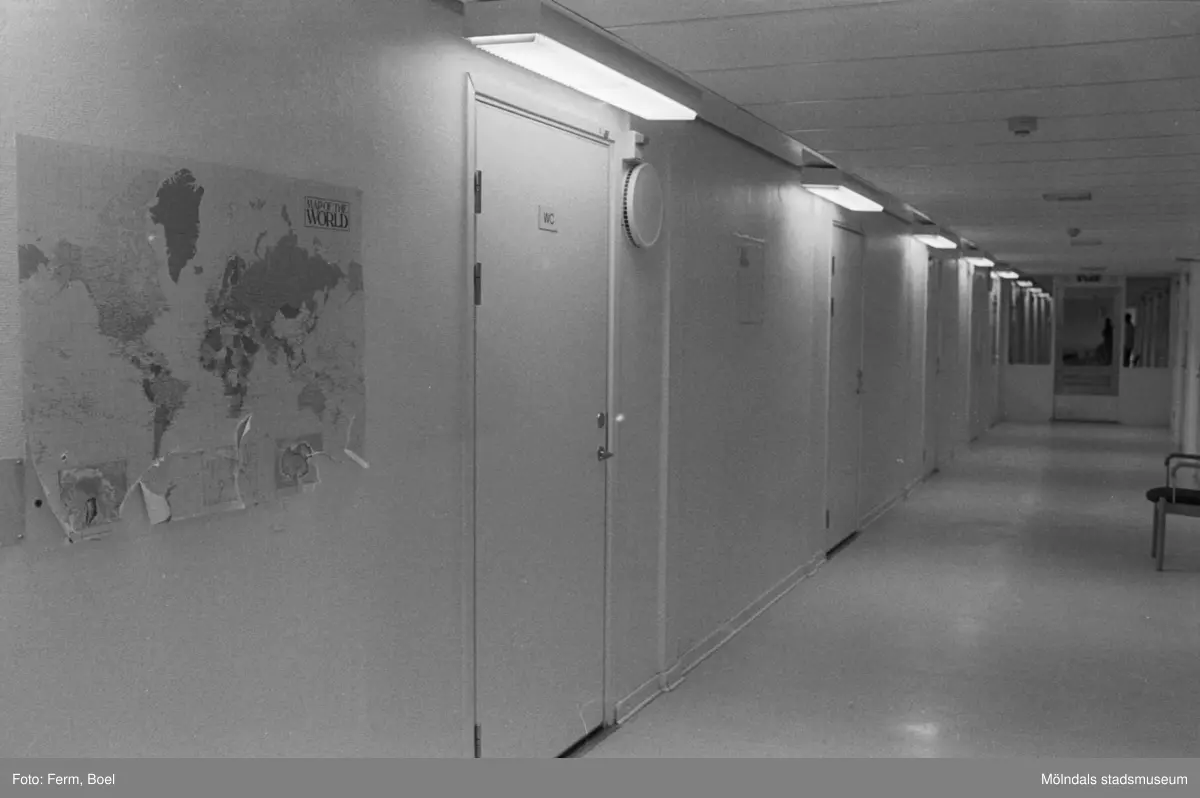 Dokumentation av Sagåsens flyktingförläggning 1992. En lång korridor med stängda dörrar. En världskarta hänger på vänsterväggen och lite längre ner i korridoren står en stol utefter en vägg.