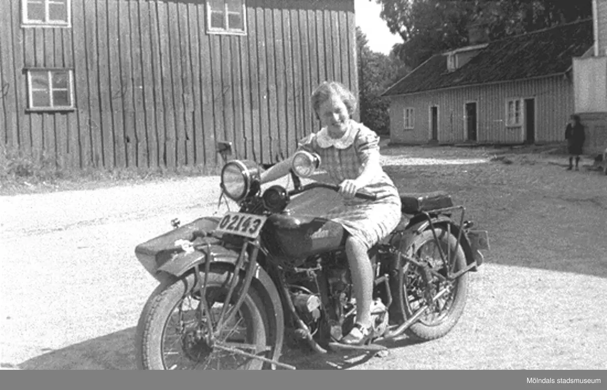 Astrid Karlsson (gift Garthman) grenslar en MC, Indian 1000cc, med sidovagn. Troligtvis är det pojkvännen Helmer Garthmans. Kvarnfallet 31, år 1936.