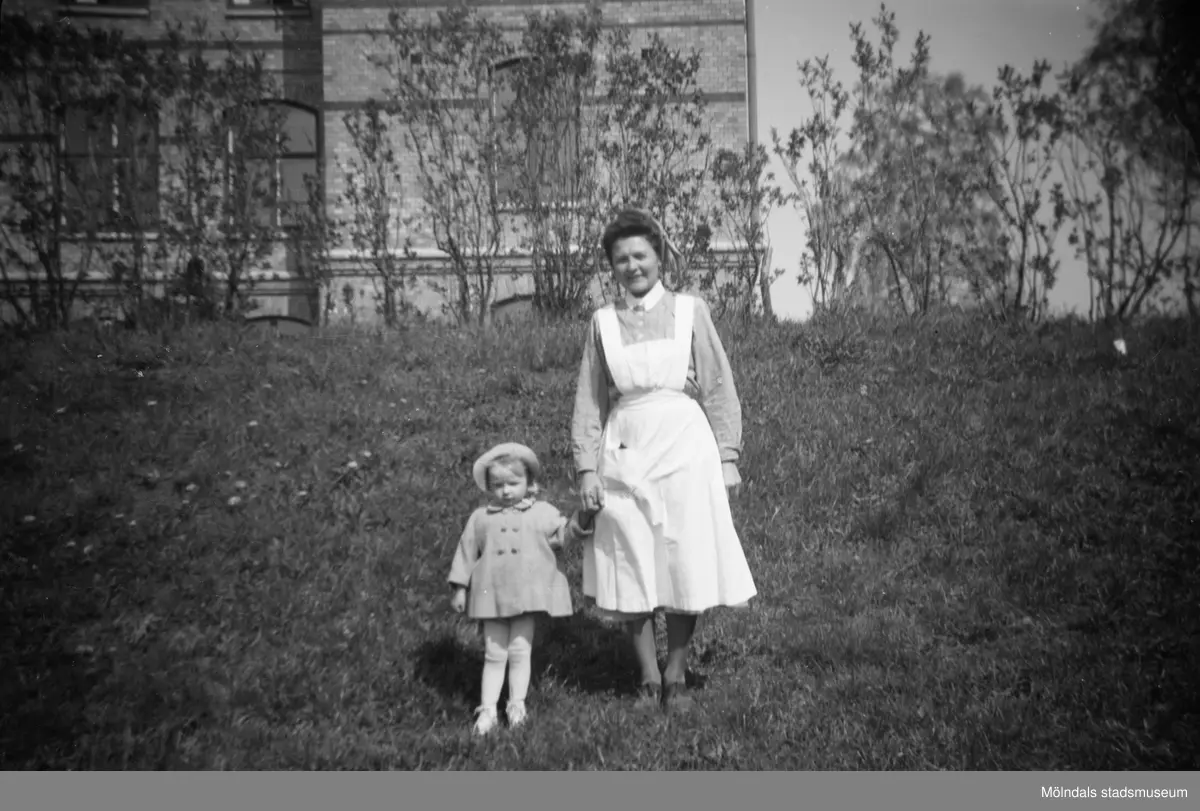 Vårdarinnan Karin Hasselberg håller ett litet barn i handen.