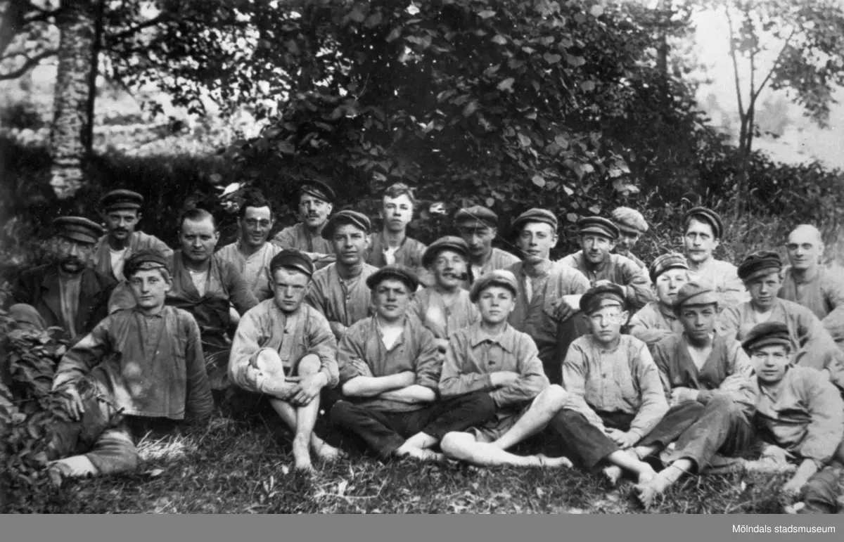 Posering för kameran i Anderstorps fabrikers omgivning, 1919-1920. Ett skift textilarbetare med bl a John Alfred Andersson (övre raden, andra från höger) och sonen Elis Andersson (nedre raden, tredje från höger).