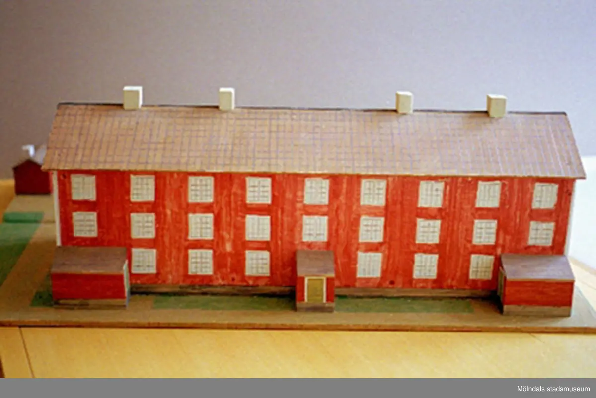 Ett rött bostadshus med tio fönster i rad, tre våningar högt, och tre entréer. På taket finns fyra skorstenar. Vid sidan av ligger två mindre stugor. Huset är en kopia av "Byggninga" som var arbetarbostäder till Anderstorps fabriker i Lindome. Se även 1994_0992 och 1994_0993. Harry Bergmans "gubbar" (träfigurer).