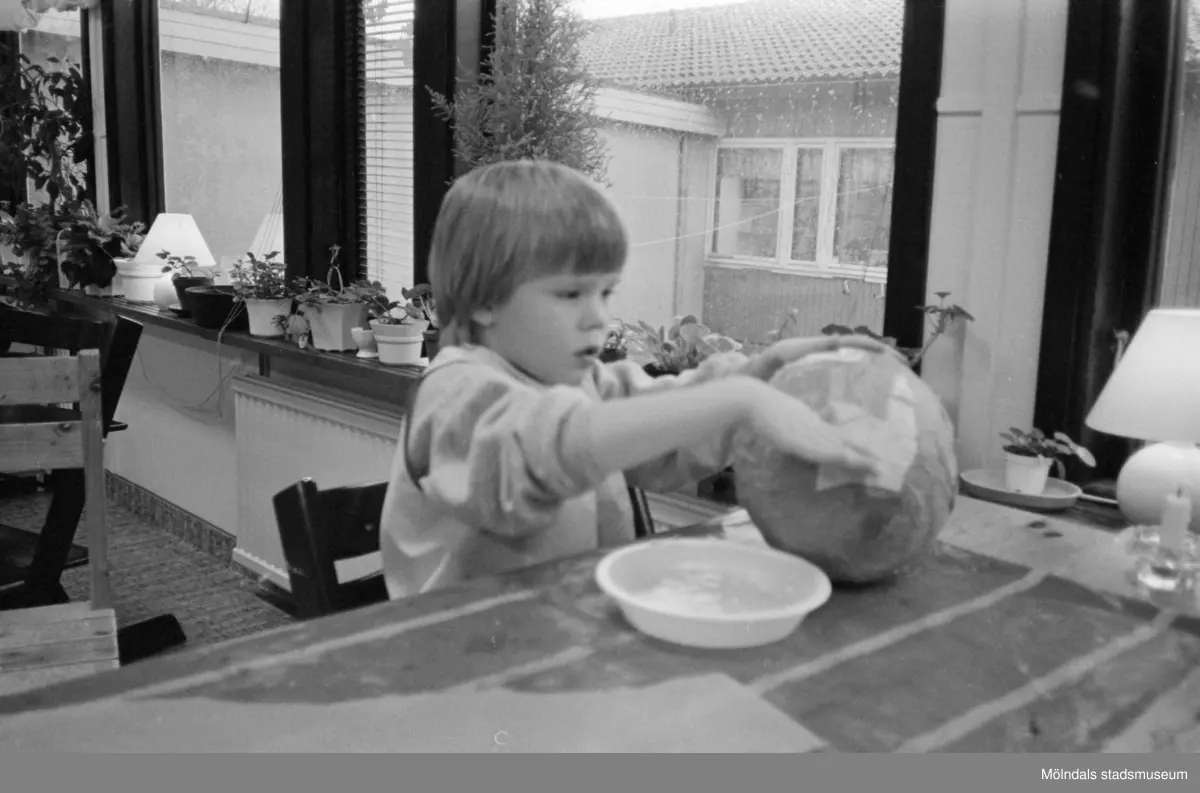 En pojke sitter vid ett bord, inomhus på Katrinebergs daghem, och limmar silkespapper på en uppblåst ballong. Limmet ligger på en plasttallrik framför honom och han jobbar koncentrerat.